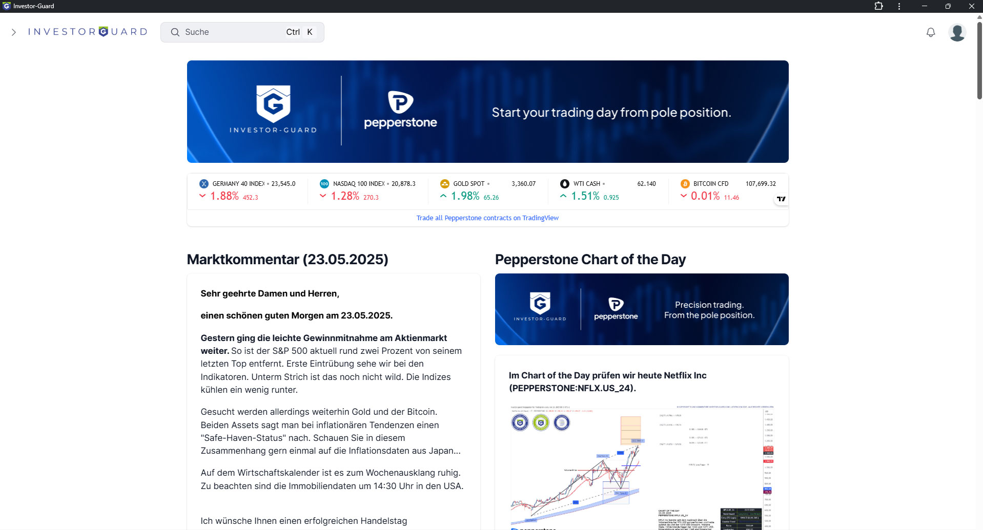 Der Daily Guard Plus ist Ihr optimaler Start in den Handelstag. Mit ausgewählten Nachrichten, Konjunkturdaten und täglichen spannenden Chartanalysen sind Sie fokussiert und immer up to date. Regelmäßige konkrete Handelsideen umfassen Detailanalysen und die Kommentierung von CIO Thomas Jansen.