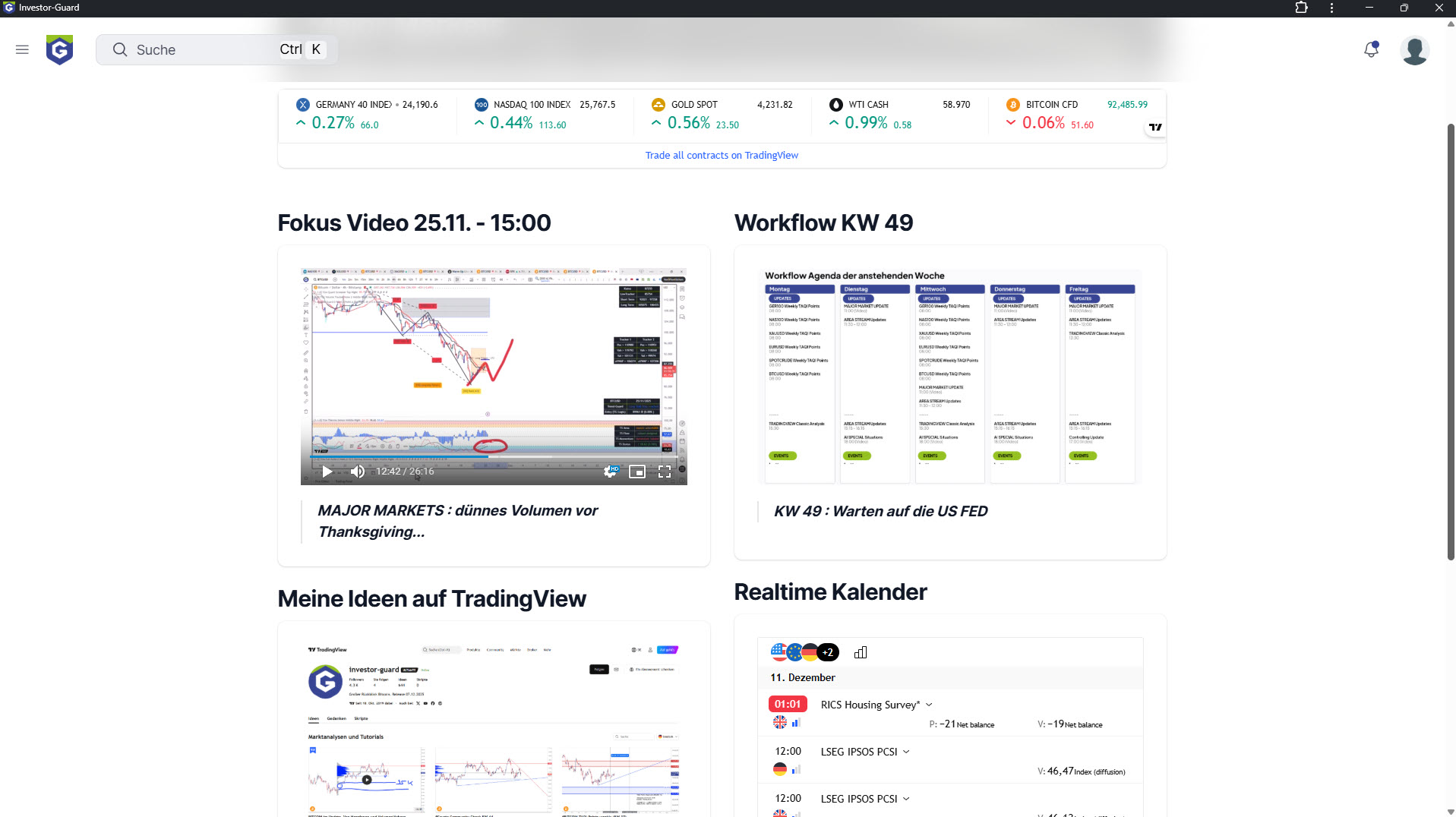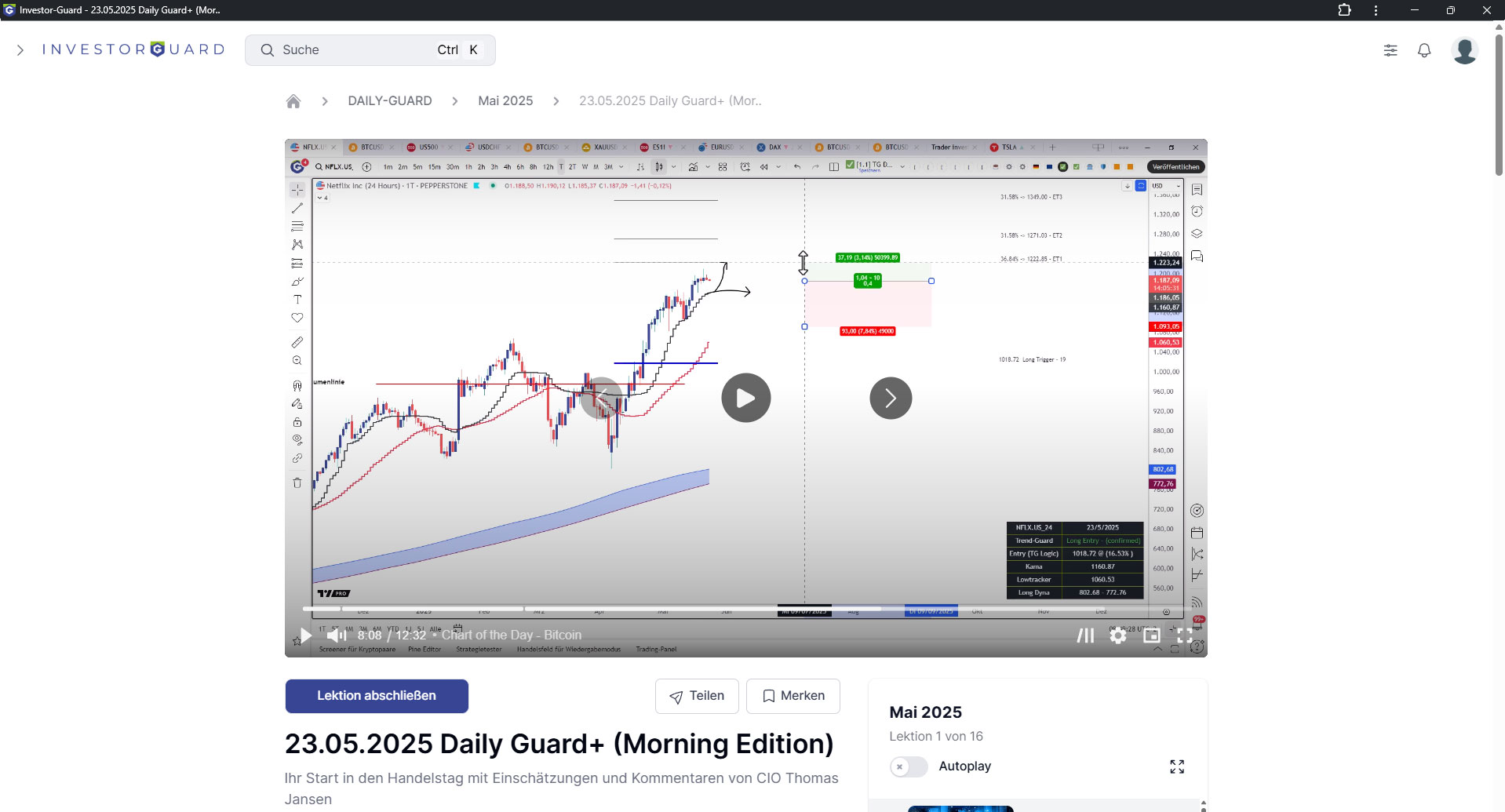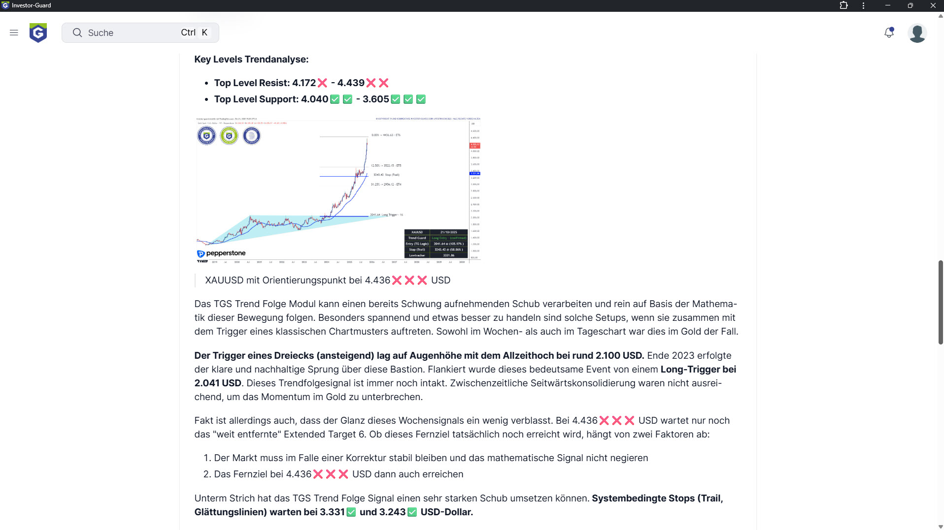 Handeln Sie mit den Profis von Investor Guard und profitieren Sie von einer optimierten Tagesroutine inklusive präziser Analysen (TMMA) sowie dem KI-Trading Assistenten TREND-GUARD (Vollzugriff).